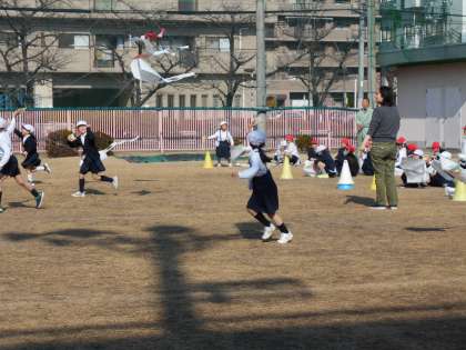 それぞれ 授業で作成した凧を、お昼からみんなで一緒にあげました。