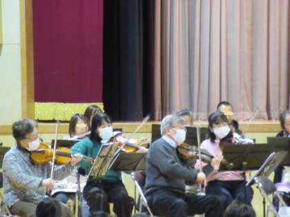 土曜授業の日に「 響 (ゆら) 」さんに来ていただき、講堂で生のオーケストラ演奏を鑑賞しました。低学年の部、高学年の部と別れて 2回にわたっての演奏をしていただきました。