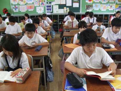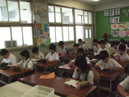 落ち着いた態度で読書に集中しています。学級文庫や図書室から借りた本。中には自宅から持ってきた本を読んでいる人も。「怪談レストラン」「伝記」「総合的な学習に関わった本」が読まれています。