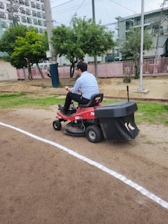 運動会に向けて、管理作業員さん達が運動場の草刈りを