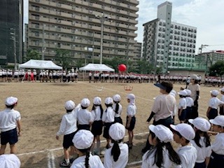 赤組・白組、それぞれみんなで力を合わせて、大玉を送ります。