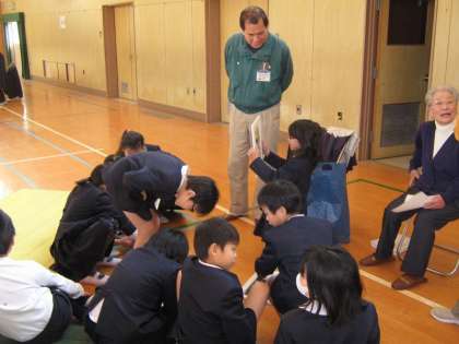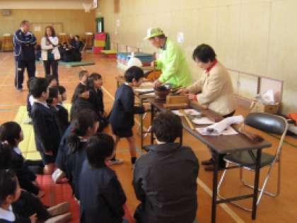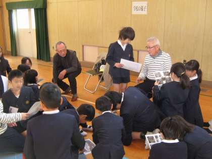 今とは違う関目の様子に児童は興味津々でした。昔の学校や地域の写真を見せていただけるブースでは、驚きの声が多く上がっていました。
