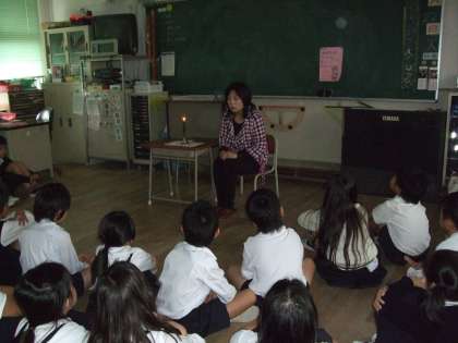 教室の灯りを消し、ろうそくを1本立てた落ち着いた雰囲気で、子ども達はお話の世界に入っています。