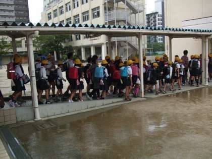 雨天のため、不審者を講堂渡り廊下で発見した想定で訓練放送を聞き、教職員の指示に従って、行動します。
