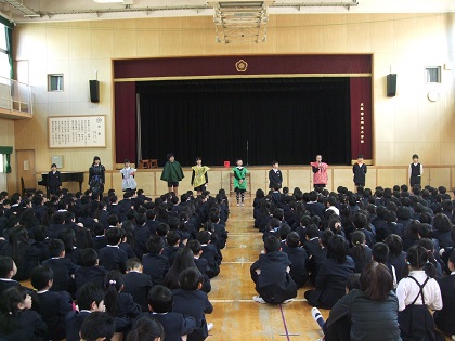 関目小学校の環境美化レンジャーが、劇をまじえて、正しい掃除の仕方を教えてくれました。発表を見ている児童も、とても楽しそうに学んでいました。