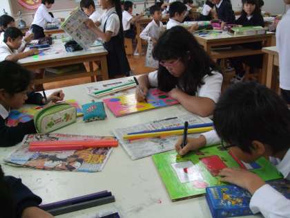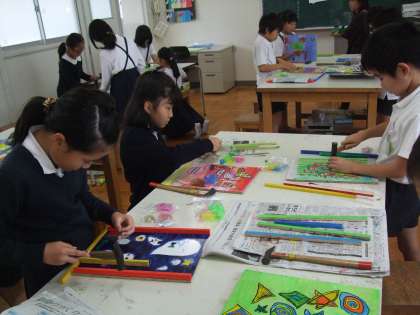 台材に絵をかき、ていねいにニスを塗っています。マジックで縁取りをしてから、