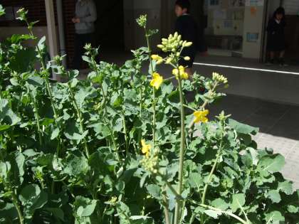 給食室前花壇のアブラナもほころんできました。