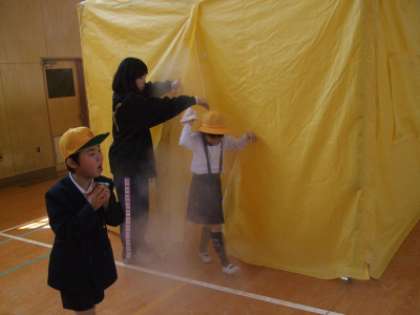 煙の中を自力で進むことがとても大変なことを、子どもたちは体験を通して学ぶことができました。