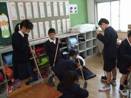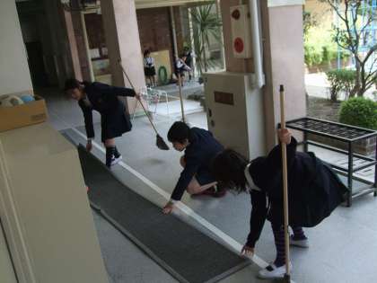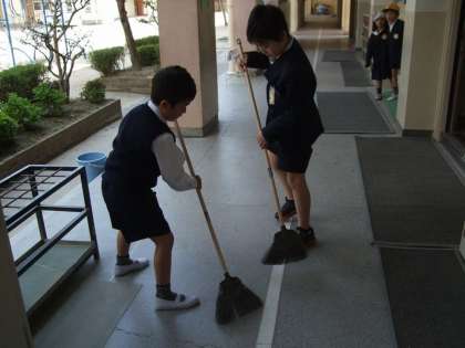 1年生ともなかよくなり、一緒にてきぱきとそうじをしています。