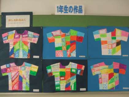 「おしゃれな服」というタイトルで、服の絵にクレヨンで色を塗っています。