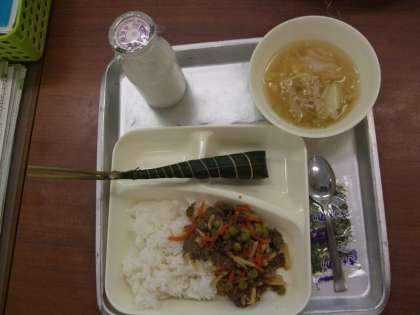 きょうの献立は、牛肉のちらしずし・すまし汁・ちまき・