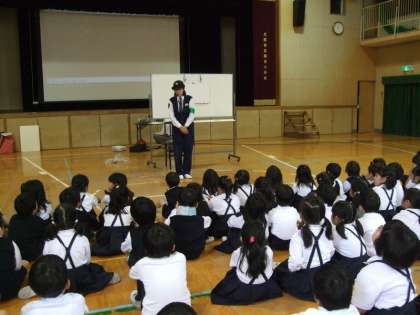 毎年行っている子どもの安全・防犯教室を大阪府警本部防犯係と