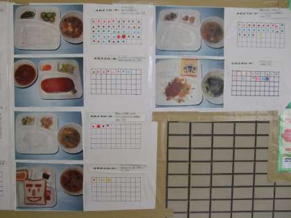 給食献立から、子どもたちが好きなものを一つ選びシールを貼っていきます。教職員も子どもと一緒に人気投票に参加しています。どの献立が1位になるのか楽しみです。現時点での1位は、カツカレーになっています!