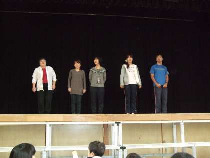 たてわり班のみんなで「ものまね」と「出題した先生」を考えます。