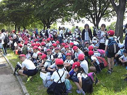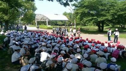 集合場所である大芝生広場で、担当の先生からの話を聞きました。