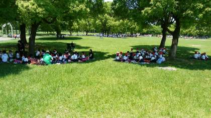 昼食をした後、少し時間に余裕がある学年は、大芝生の広場で遊んだりくつろいだりしました。