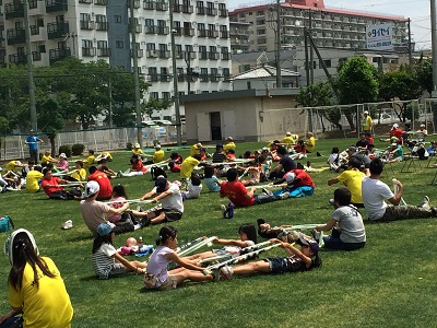 最初に芝生運動場で行われた開会式での挨拶に続き、頭の体操で始まり、受付で配られたスポーツタオルを使った体操をおこないました。
