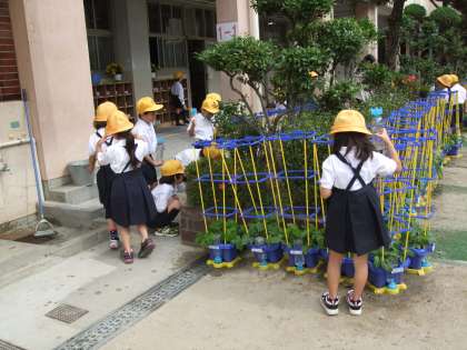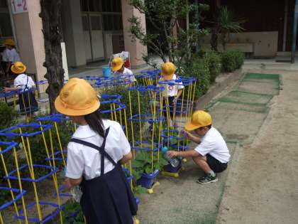 5月の初旬に種まきをした「アサガオ」が順調に育っています。ツルもぐんぐんと伸び、31日に支柱を立てました。子ども達も毎日の水やりを頑張っています。(^・^)