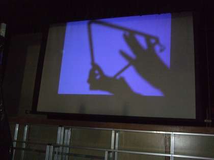 舞台のスクリーンに写っている影は、何か班で協力して考えます。
