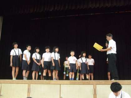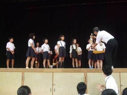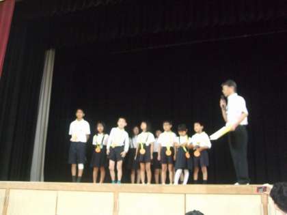 集会委員会による児童集会のあと、全校遠足のオリエンテーリングで上位3位チームが表彰されました.