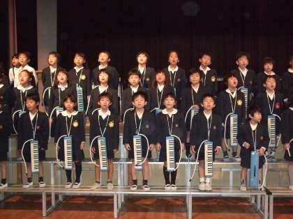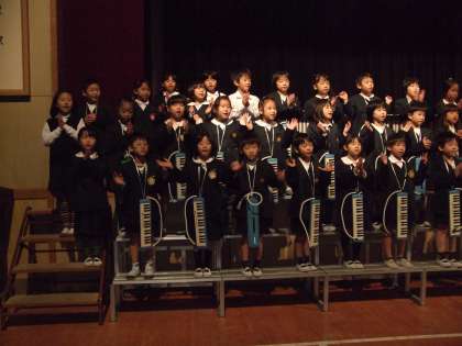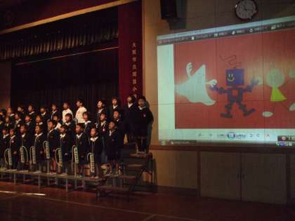 1年生は、初めての学習発表会です。入学してから7か月。頑張って練習に臨んでいました。はじめは、英語の紙芝居『みんなで ぽん』