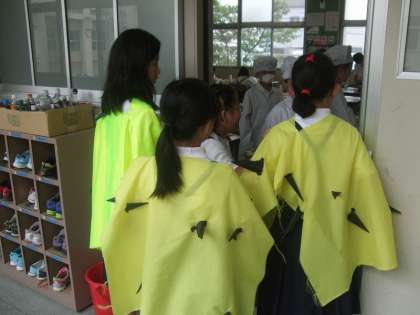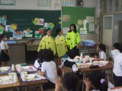 関目小学校では健康生活強調週間をおこない、手洗いうがいをしっかりするための呼びかけをしています。保健委員会の人たちが「バイキン」の衣装に身を包み、給食の時間に各教室をまわります。
