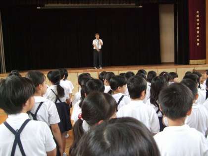 今朝は、西運動場が芝生の養生期間のため講堂で児童朝会を