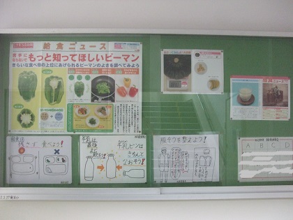 給食室の前にある掲示板板には、食べ物についての豆知識が書いてあるポスターが貼られています。