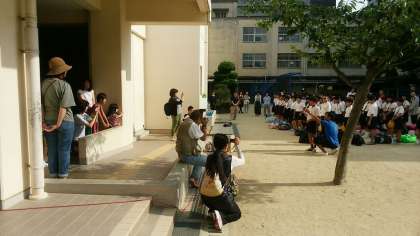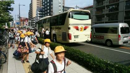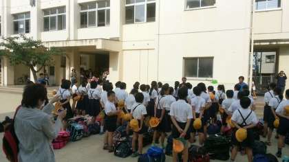 真夏の青空の下、集合時刻を待ちきれない5年生が続々と玄関をくぐってきました。