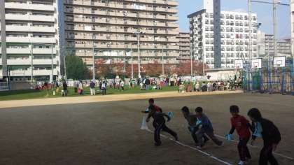 主催されている地域の方に聞くと「昨年度までは校区内の公園で行っていたが、今年から学校で行うことになって、参加者が倍近くになった。」とおっしゃっていました。子どもからご高齢の方まで、本当に気持ちのいい青空の下で、本当に気持ちのいい汗をかいておられ、元気に世代間交流ができていて良かったです!