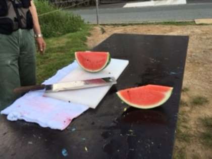オリエンテーリングをしながら山登りが終わり下山した後は、用意していただいたスイカをいただきました。火照った体に水々しくて甘いスイカは体に染みこむようでした。