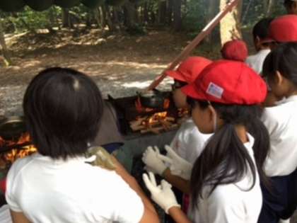 今までに七輪の学習などで、火の起こし方は知っていましたが、実際に料理を火起こしからするのはなかなかない体験です。また、5年生から始まった家庭科の調理学習で包丁は一度は手にしているものの、慣れない手つきで野菜を切り、カレー作りを進めていきます。