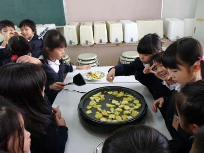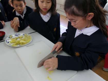 自分が食べるさつまいもを嬉しそうに切っていました。