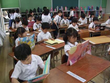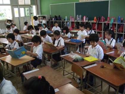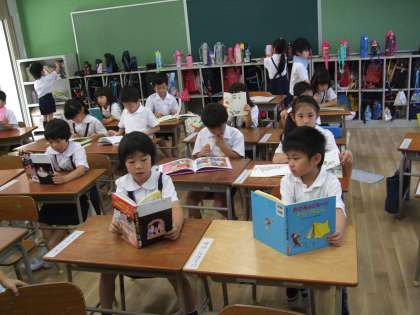 朝の読書もしっかり身に付き、落ち着いて本に向かっています。「にじいろのさかな」・「14ひきのひっこし」・「あいうえ おちあいくん」…絵本をどんどん読み進み、次々と本を代えていきます。また「おばけマンションシリーズ」も人気で、厚い本をじっくり読んでいる人も見られました。