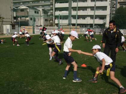 菫中学校校下1中3小での連携した取り組みの一環として、菫中学校の体育科の先生方に来ていただいて「タグラグビー」の指導を受けました。