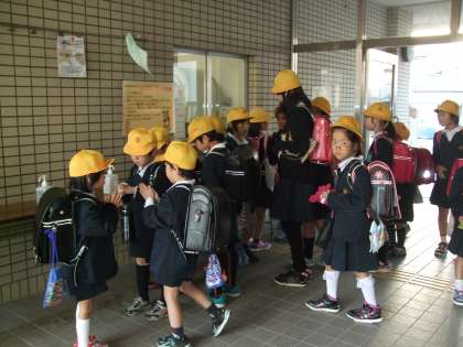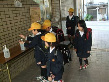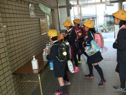関目小学校では、感染症の予防の一環として玄関に「速乾性手指消毒剤」を置き、登下校時の消毒を呼びかけています。