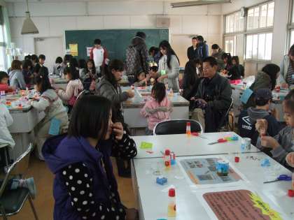 円筒形の小箱にスパンコールやカットした色紙を上手に貼り付けて、オリジナルな箱を作っています。ここでもおうちの方を楽しそうに作っています。