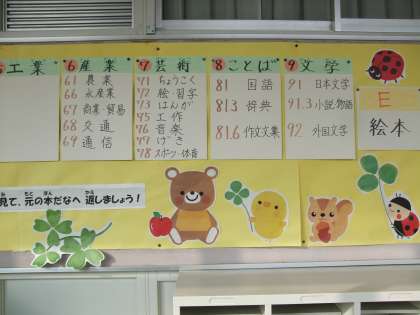 図書室内に掲示されていた図書の分類表が、リニューアルされて図書室前廊下に張り出されました。この表を参考にしていろいろな分野の図書に触れて欲しいです。