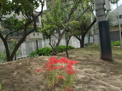 運動場の東側の果樹園でヒガンバナを見つけました。
