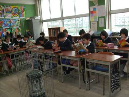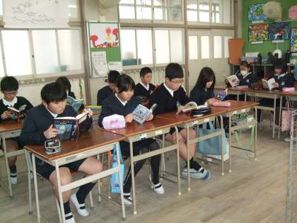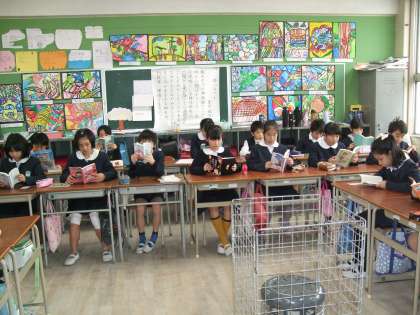 「ちびまる子ちゃんの○○辞典・○○教室」・「青い鳥文庫シリーズ」などが読まれています。学級文庫には、「ワンピース」の読み物や「おはなし ちびまる子ちゃん」がならんでいました。