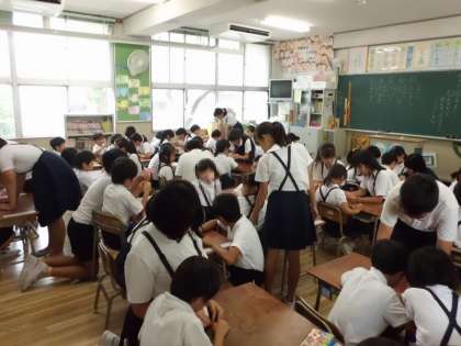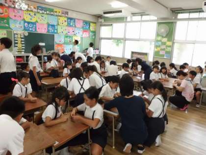 1年生がお昼休みにつるを折りました。1年生だけではつるを折ることがむずかしかったので6年生のお兄さんお姉さんがお手伝いにきてくれました。1年生の人たちは一緒に折れてとてもうれしそうでした。