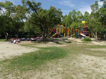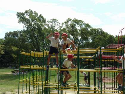 オリエンテーリングも終わり、場所をわんぱくランドに移しての昼食と待ちに待った遊具での自由時間です。