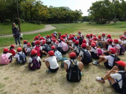 それぞれ、好きな場所にわかれ昼食をとり、その後、遊具で遊びました。大泉緑地のわんぱくランドには長いすべり台やジャングルジム、ターザンロープなど様々な遊具があり、子どもたちも時間の許す限り遊んでいました。