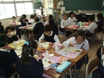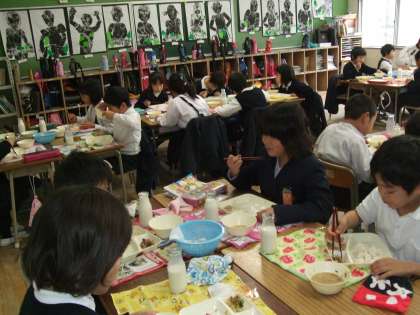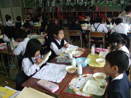 さつまいも・うすあげ・人参・しめじ・もやし・青ねぎがたっぷり入った具だくさんのみそ汁は、赤みそと白みそで味付けされていて、「おいしいよ」っと教えてくれました。