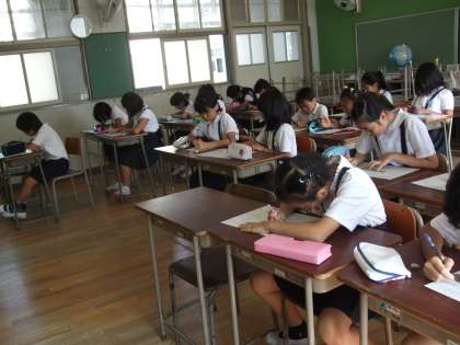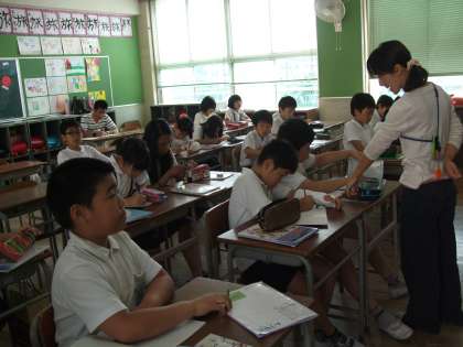 学習内容の理解を深めるため、単元によって学年を3分割にした「少人数指導」を行っています。5年生は、「小数のわり算を考えよう」を学習していました。20数名と人数が少なく発表する機会も増えて、子ども達は学習に集中しています。