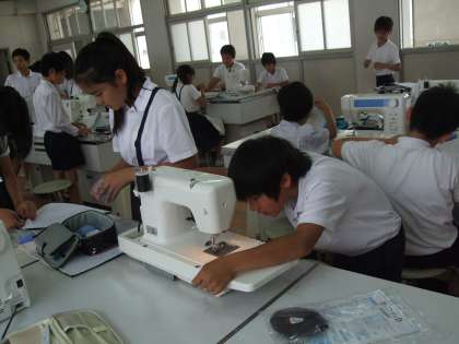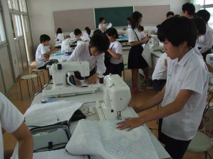 赤い糸でしつけ縫いをし、黒い糸でミシンをかけます。わき口は、手縫いです。厚みのあるキルティングを縫うのは、少々むずかしいようです(>_<)