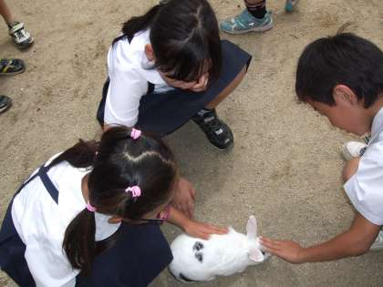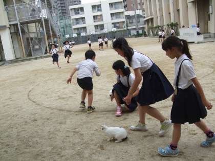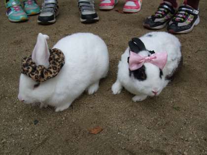 学校で飼っているウサギのライト(茶色のリボン)とローラ(ピンクのリボン)です。給食室前のウサギ小屋にいます。やんちゃなライトが、ローラの餌も食べることがあり、日中は別々の小屋に入れることもあります。係りの児童が、昼休みに交代で小屋の掃除・餌や水の取り換え・散歩の世話をします。ウサギが小屋の外に出されると低学年寄ってきてかわいがってくれます。