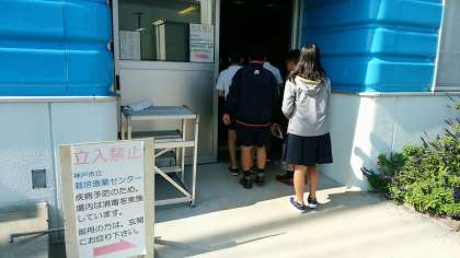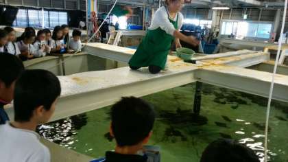 まず、靴を消毒用のマットで消毒してから、実際に魚を育てている様子を見学する施設に入場しました。ヒラメへのエサやりの様子を見せていただきました。観賞用として水族館等で見慣れた雰囲気とは違う様子に、少し驚いているようです。