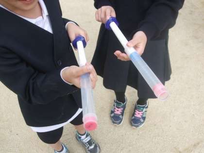角度を変えたり、閉じ込める空気の量を変えたりして飛距離を伸ばしていました。子どもたちは、楽しみながら創意工夫していました。