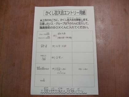 集会委員会主催の「かくし芸大会」が、2月の中ごろに開催されることが決まり、その募集が始まりました。